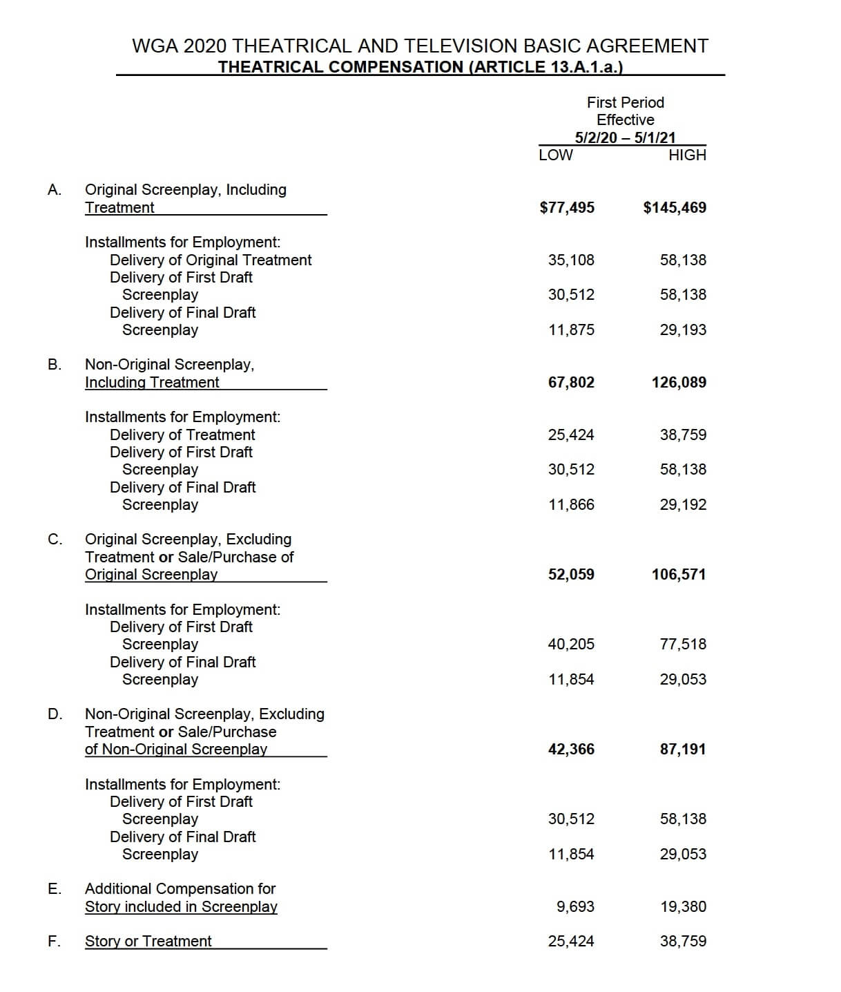 The WGA minimum is the lowest amount of money a WGA writer can earn for writing a script, but rates rise year after year. In 2020, WGA released a “WGA schedule of minimum” which states the theatrical and television basic agreement. WGA spec script sales ranged from $77,000 to $145,000 so the average will cost around $68,000. The payments for selling a screenplay are done through installments. See the example below: