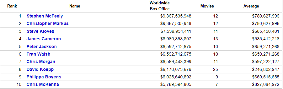 So, here is the list of the top 10 world’s highest grossing screenwriters based on the worldwide box office of the movies they worked on.