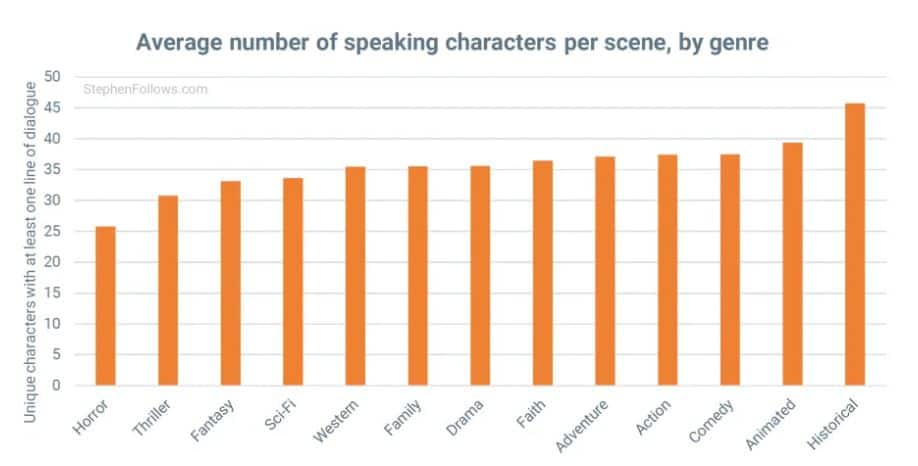 Horror has the least amount of speaking characters that makes sense right. Especially, with Freddy and Jasons, no child left behind policy. Then, Historical being the most seeing that you can’t change history if there were 70 men running on the battlefield and they all say “charge” then guess what.