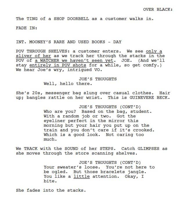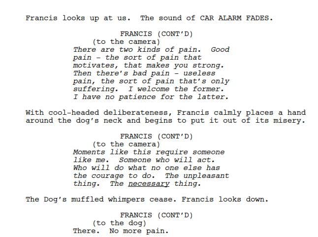 Yes, there are different ways to write an inner monologue. The first way is shown above and is a great basic example. We have some better script examples we can pull from recent famed Netflix dramas. One is “You” the other being “House of Cards.”