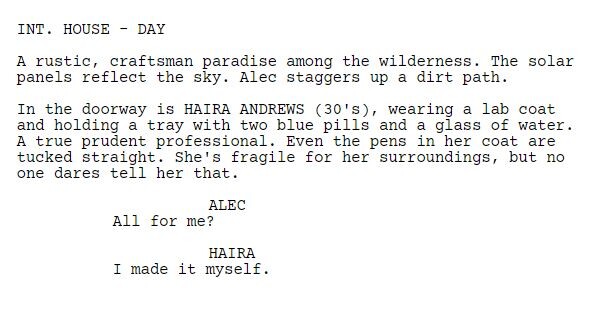 This image is from the last script I wrote. As you can see, one of my characters is in all caps as “HAIRA ANDREWS,” and then right below her first piece of dialogue, her name is also all caps, but I decided to leave off her last name.