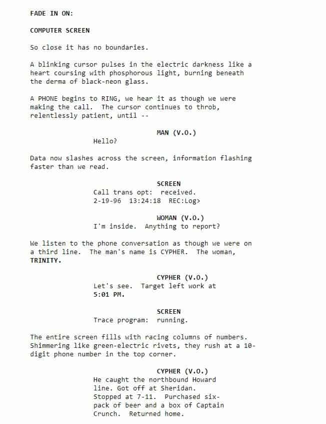 Take a look at page one of the most famous spec scripts of all time, The Matrix, written in 1996.