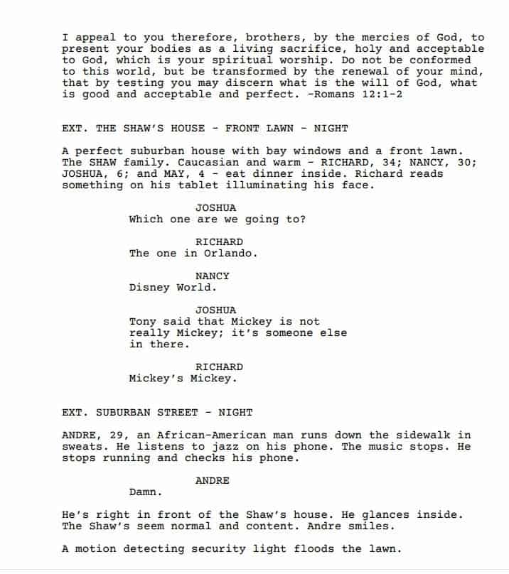 Take a look at this video of Whiplash, a movie written for the screen, not for the reader, and look at how much detail the script contains. This is a great script, but you shouldn’t do it if you’re an unknown.