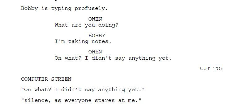 This is different from putting text on screen normally referred to as an “INSERT” “ANGLE ON.” This is represented by the words “COMPUTER SCREEN” below.